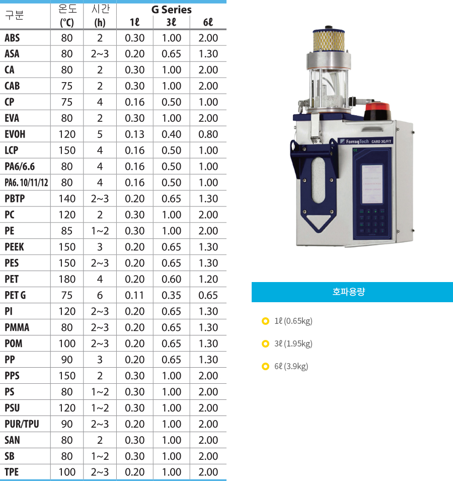 G Series는 초소형 성형기의 구조에 맞춰 최적화된 초소형 제습기입니다. ※ 컨트롤러 계통을 간편하게 만들어 편리성을 향상시킨 모델도 구비되어 있습니다.
