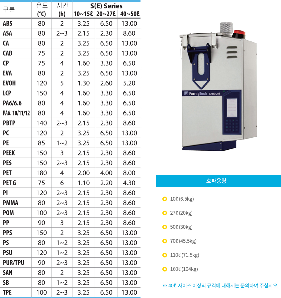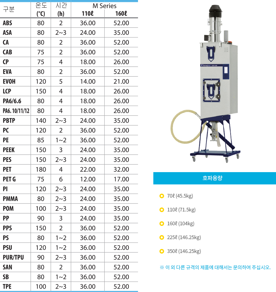 건조용량이 10ℓ ~ 160ℓ까지로 폭 넓게 사용가능하며 중앙공급설치 및 컴팩트한 설계로 성형기에 직접 설치도 가능한 제품입니다. ※ 컨트롤러 계통을 간편하게 만들어 편리성을 향상시킨 E Series.