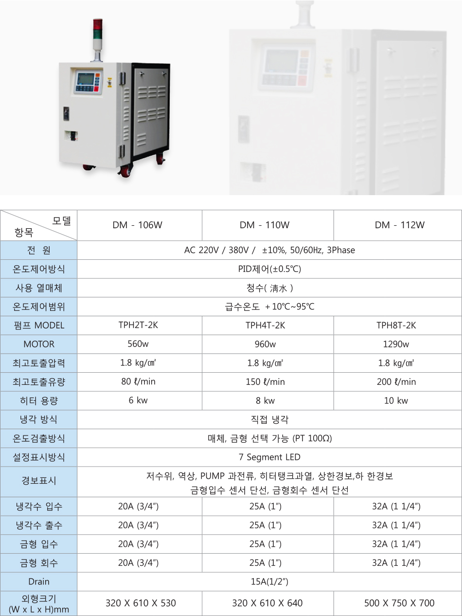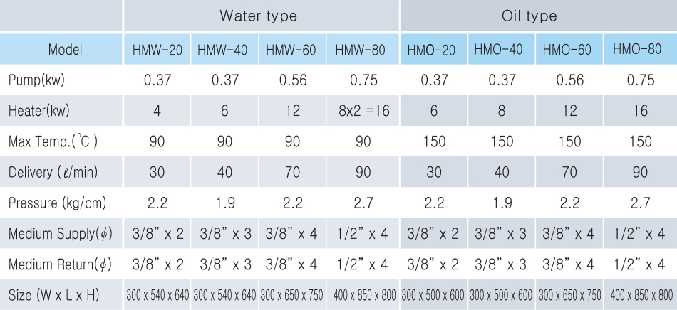 ※ 고온 Type은 내부구조가 기밀유지되는 방식으로 고온용 Pump 가 적용되며 일반사양보다 Heater용량이 2~4Kw 커집니다.